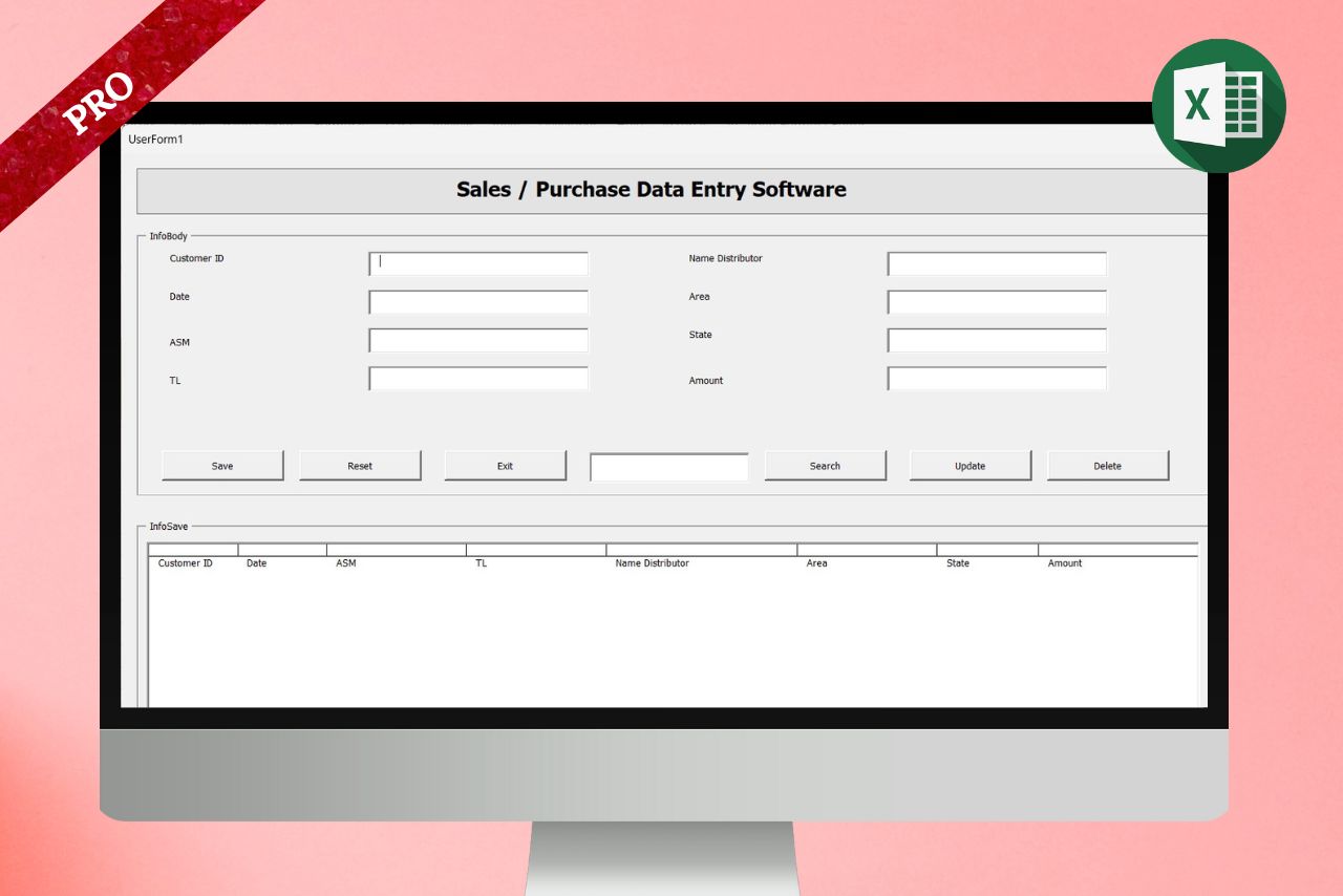 When you click the Start Button, the VBA Data Entry Form opens. This form is used to enter all sales or purchase details such as Customer ID, Date, Area Manager, Team Leader, Distributor, Area, State, and Sales or Purchase Amount.